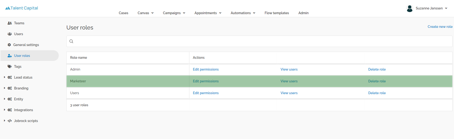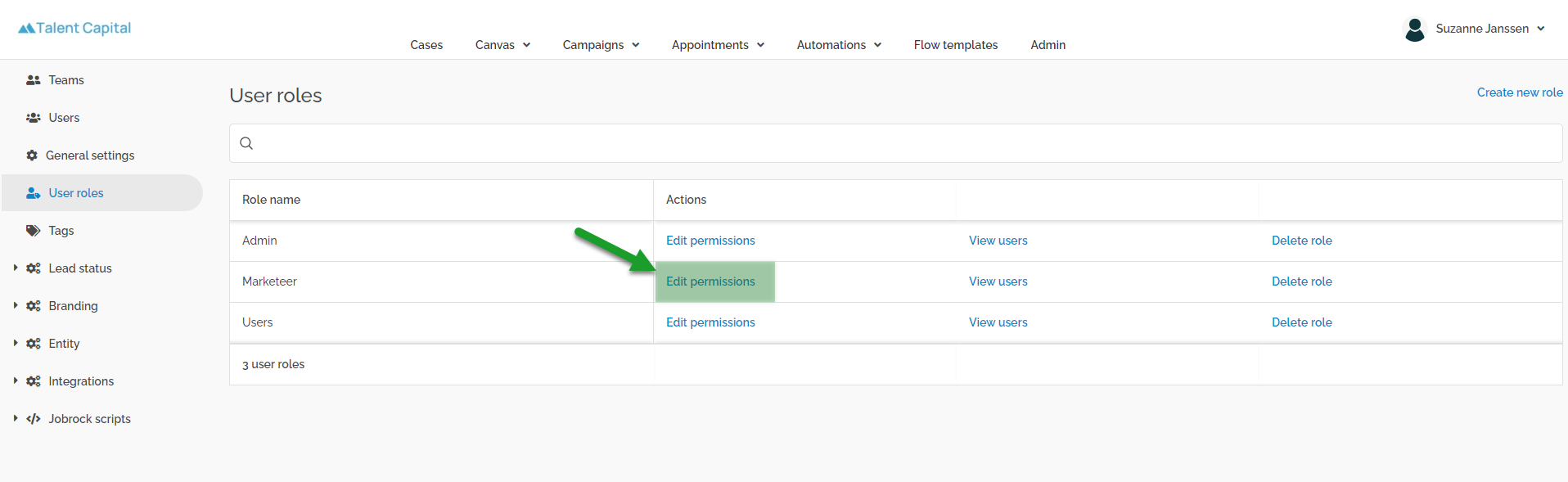 Go to the User roles section in the Jobrock admin module via Admin > User roles.
