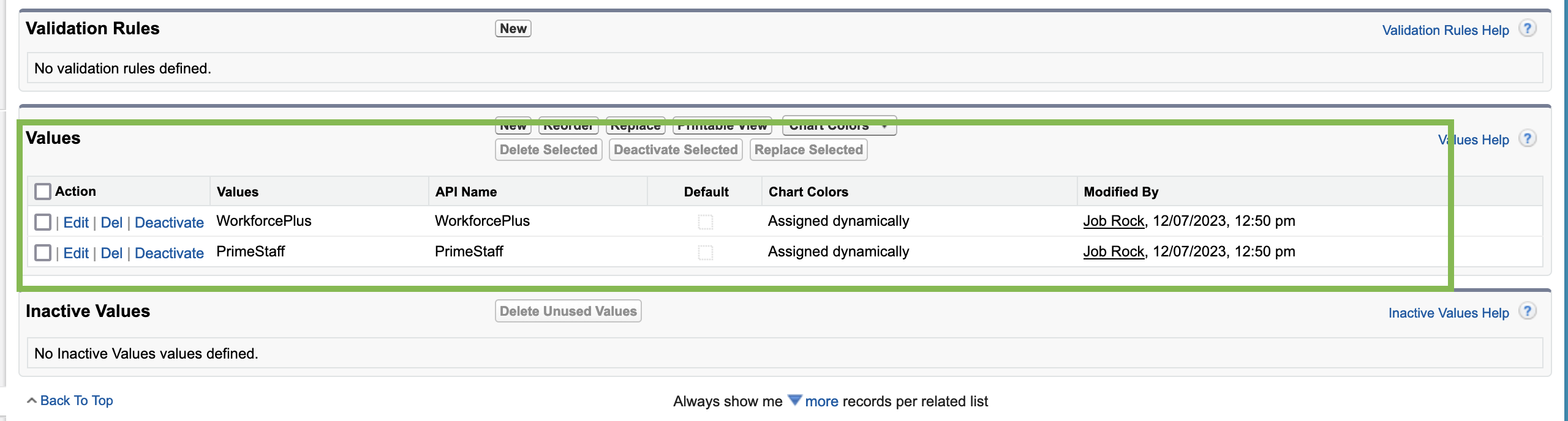 You have successfully set up a dependent picklist in Salesforce. The next step is linking the brand labels with their associated Jobrock client codes. Then, when users select a brand, the corresponding client code will be automatically populated.