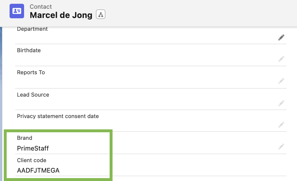 In the following example, the contact has been associated with the 'PrimeStaff' brand, and as a result of the above configuration, the corresponding 'Client code' has been automatically assigned.