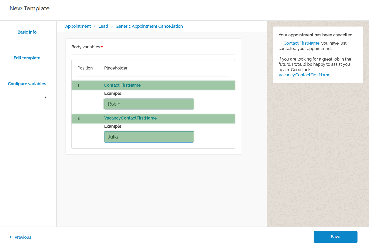 RELATED ARTICLE: Use variables such as {{1}}, {{2}}, etc. to personalize templates with names, recruiter names, vacancy or appointment details, etc. Read more about variables here.