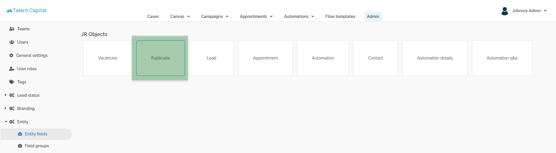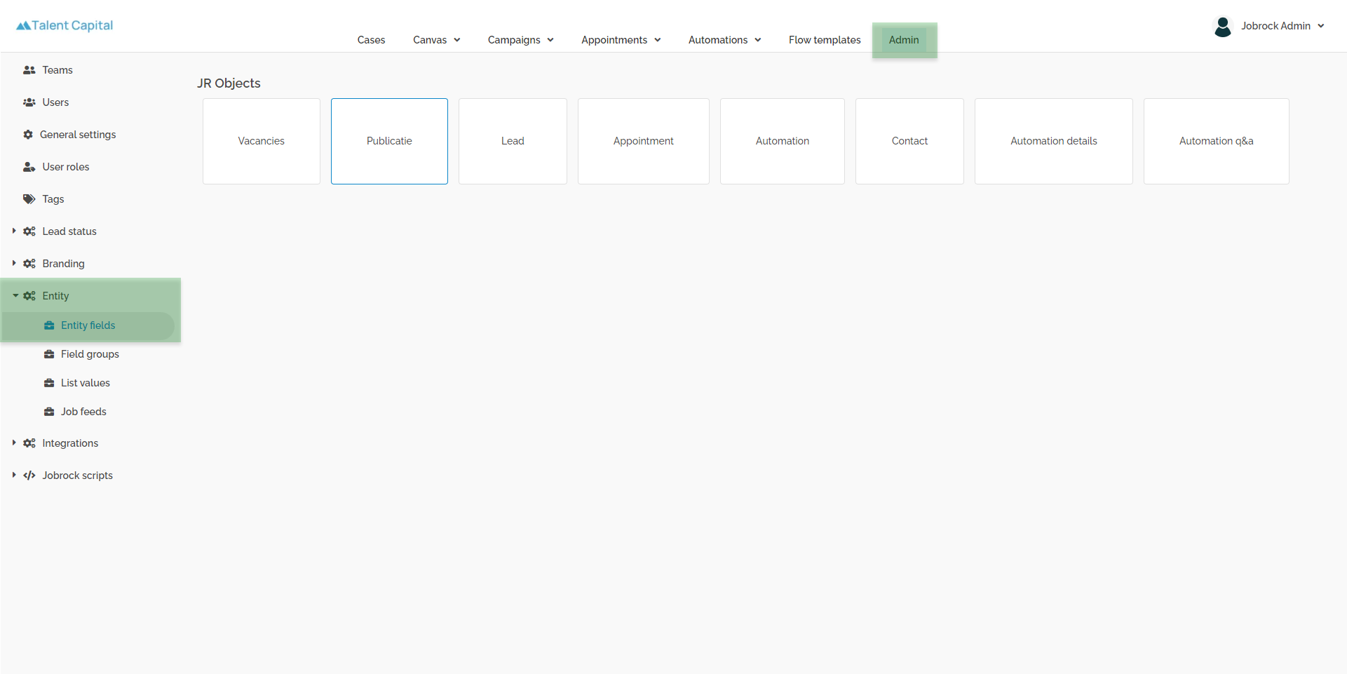 Go to the Entity fields configuration screen in the Jobrock admin module via Admin > Entity > Entity fields.