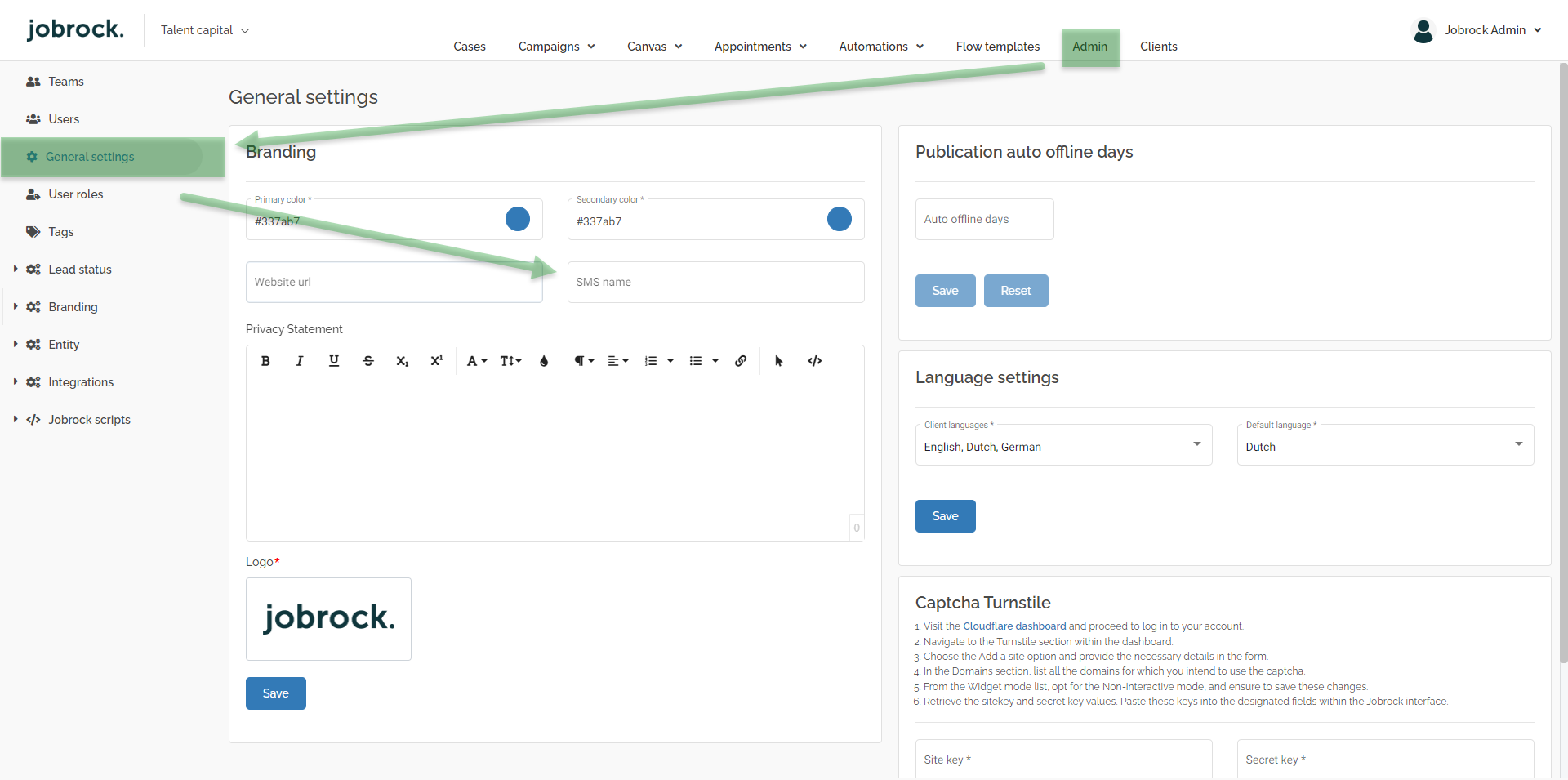 Go to the General settings in the Jobrock admin module via Admin > General Settings.