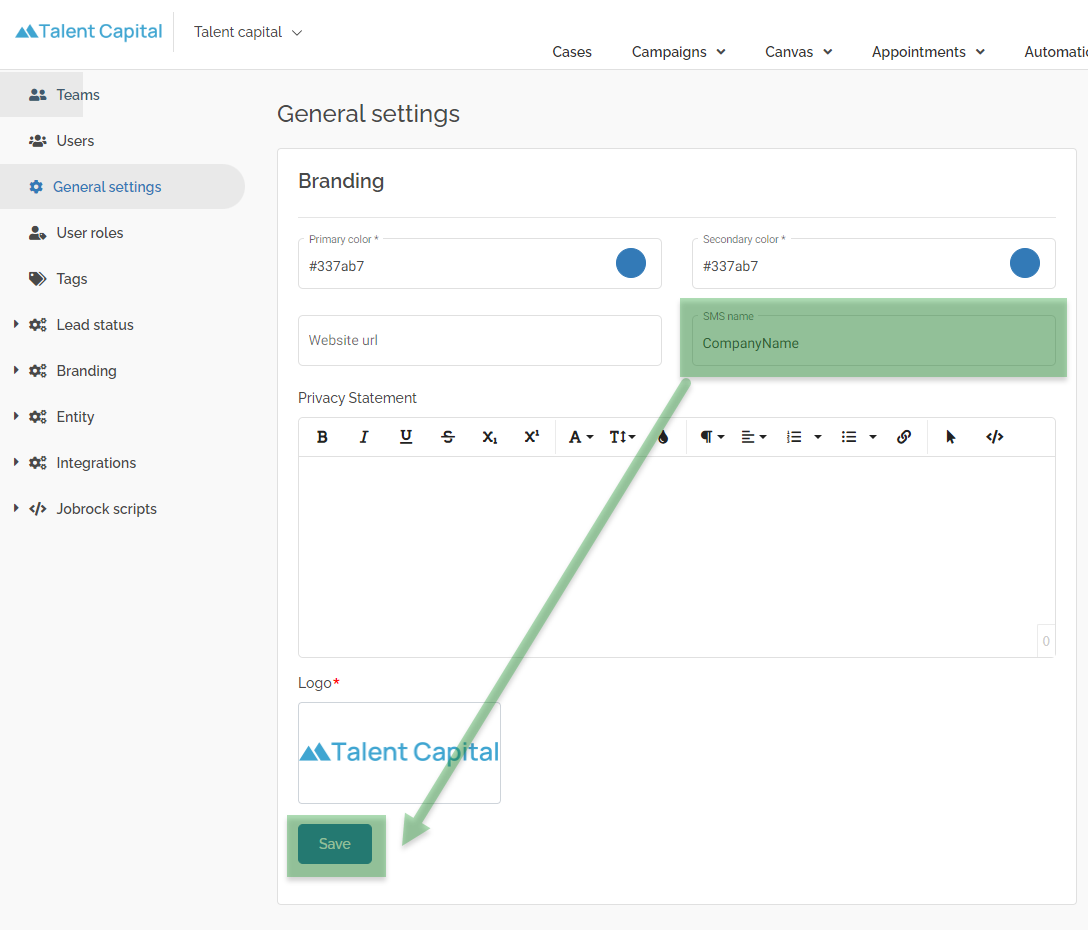 This article shows you how to add or update the SMS name which is used when you send SMS texts to contacts or candidates from Jobrock.
