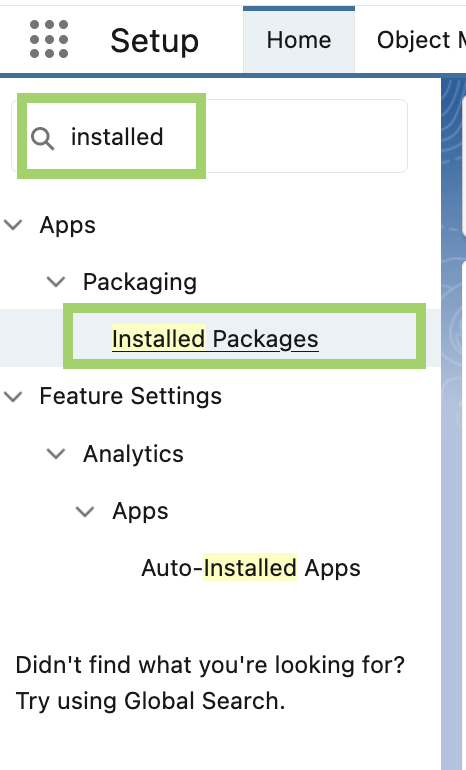 To begin, navigate to the Setup page and enter "Installed" in the Quick Find box. Then, select "Installed Packages" under the "Apps" section.