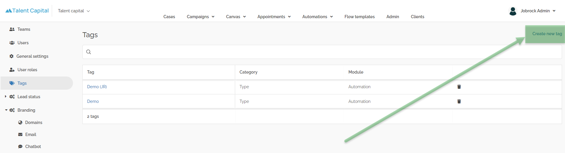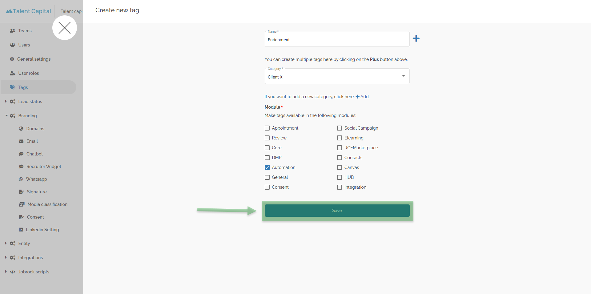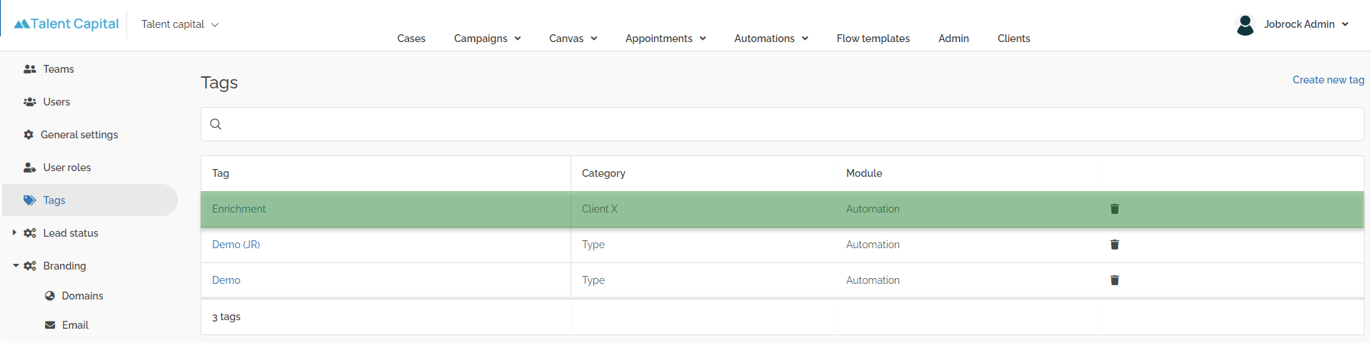 example: in this example we create a tag for a specific type of automations "Enrichment" . All automation which are created to enrich candidate profiles we would like to tag with this label.