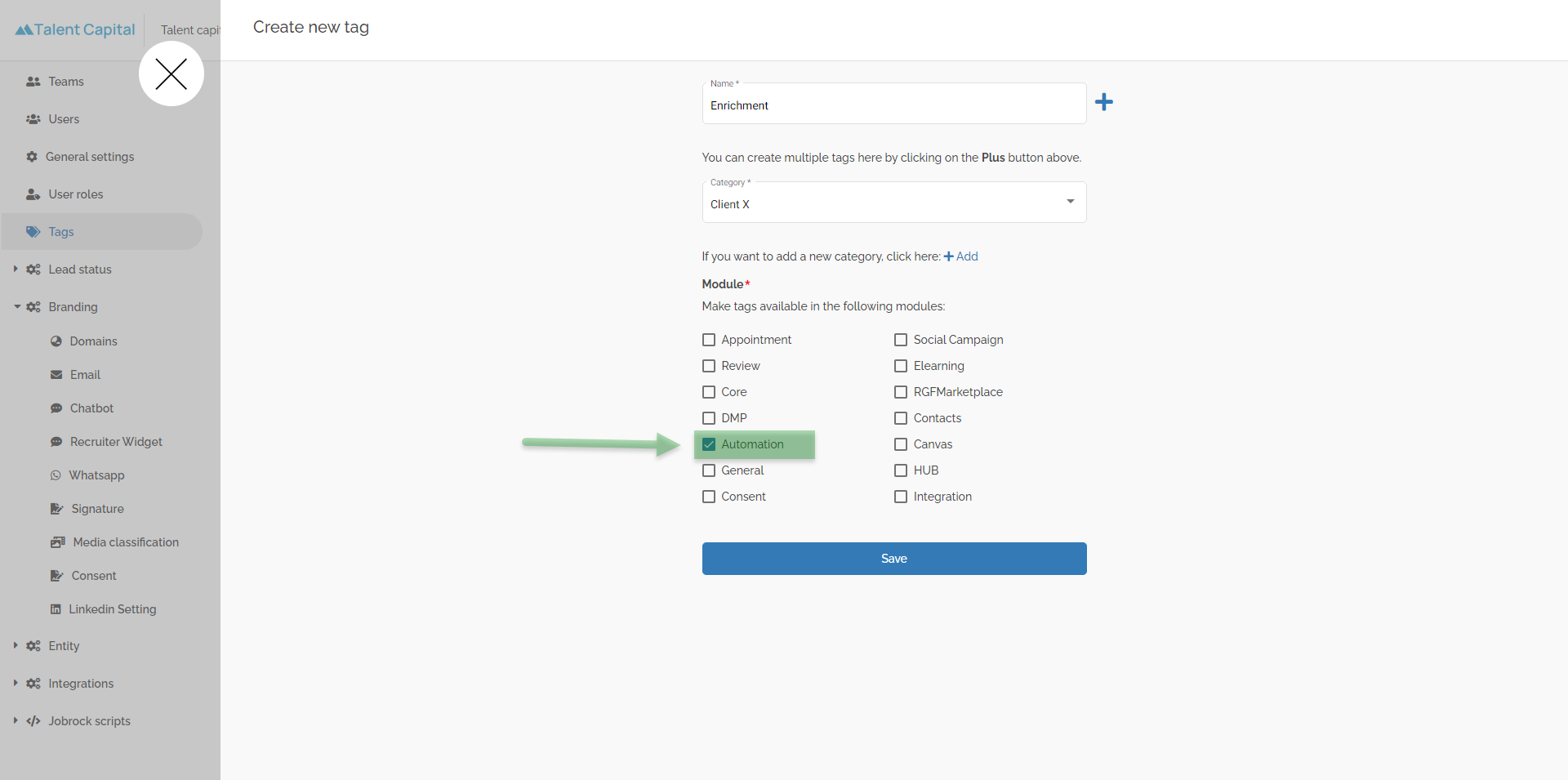 Select "Automation" tickbox. Save the tag