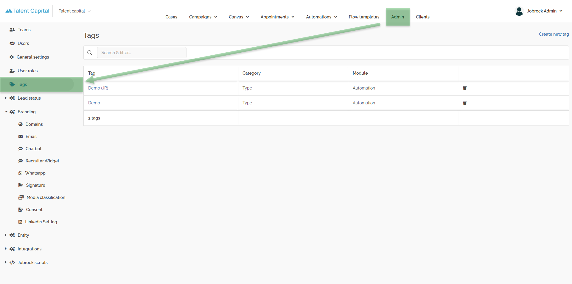 Go to the Tags screen in te Jobrock admin module via Admin > Tags.
