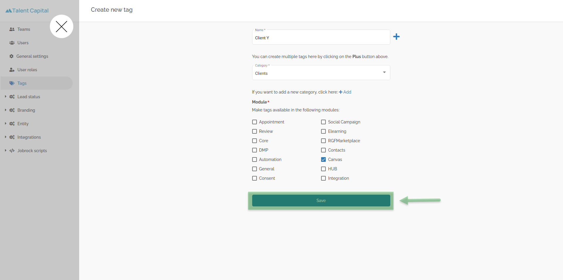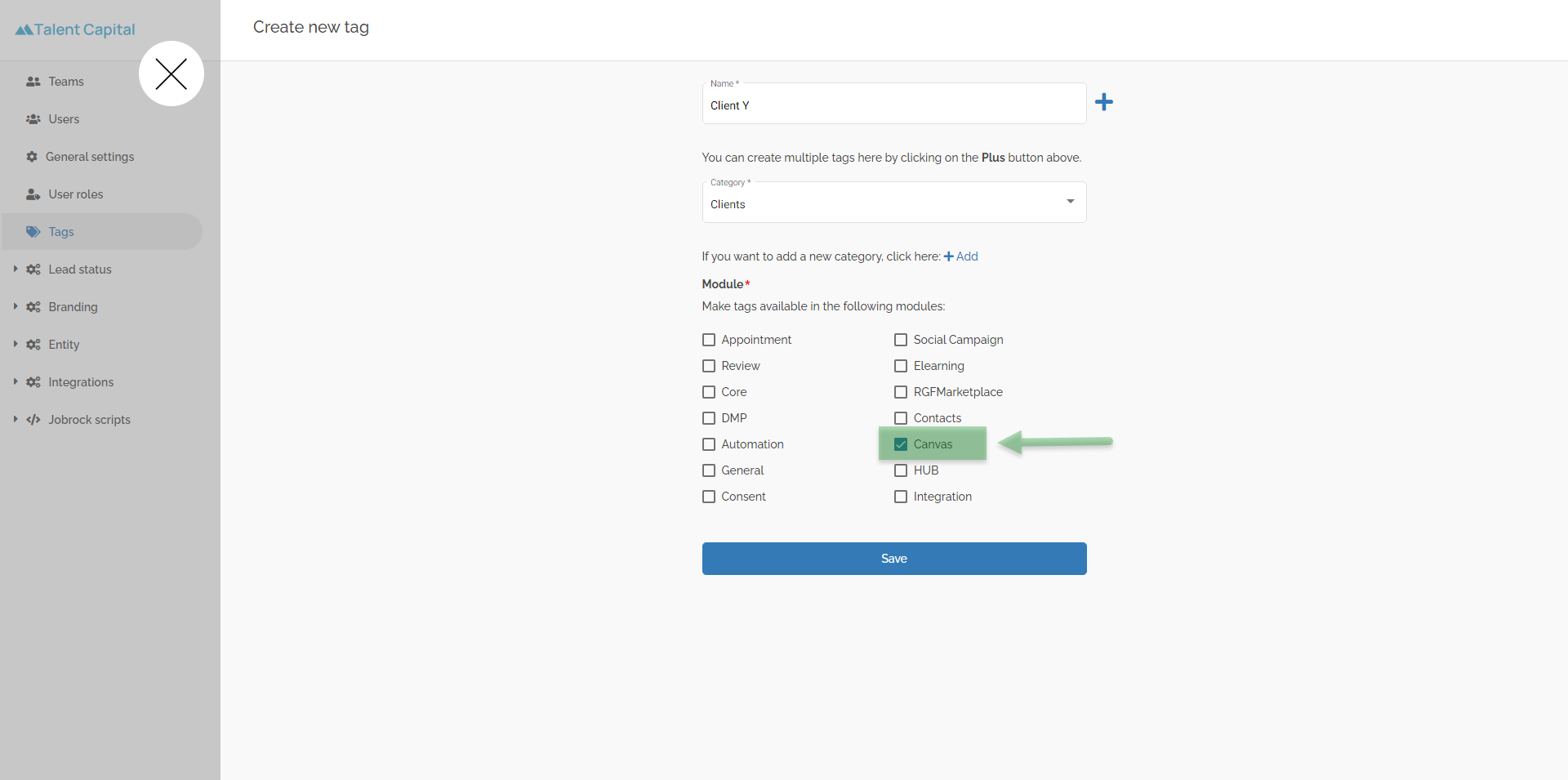 Tags can be used in different modules throughout the Jobrock suite. In order to use tags to label an canvas pages select the Canvas tickbox.