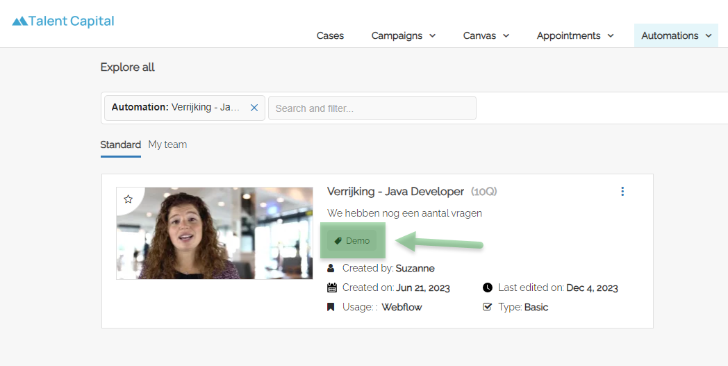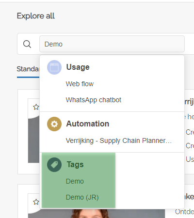 When entering the tag in the search bar, the search results will now return the matching tags in the "Tags" section of the drop down. After you click on the tag it will show you all the automations with this tag.