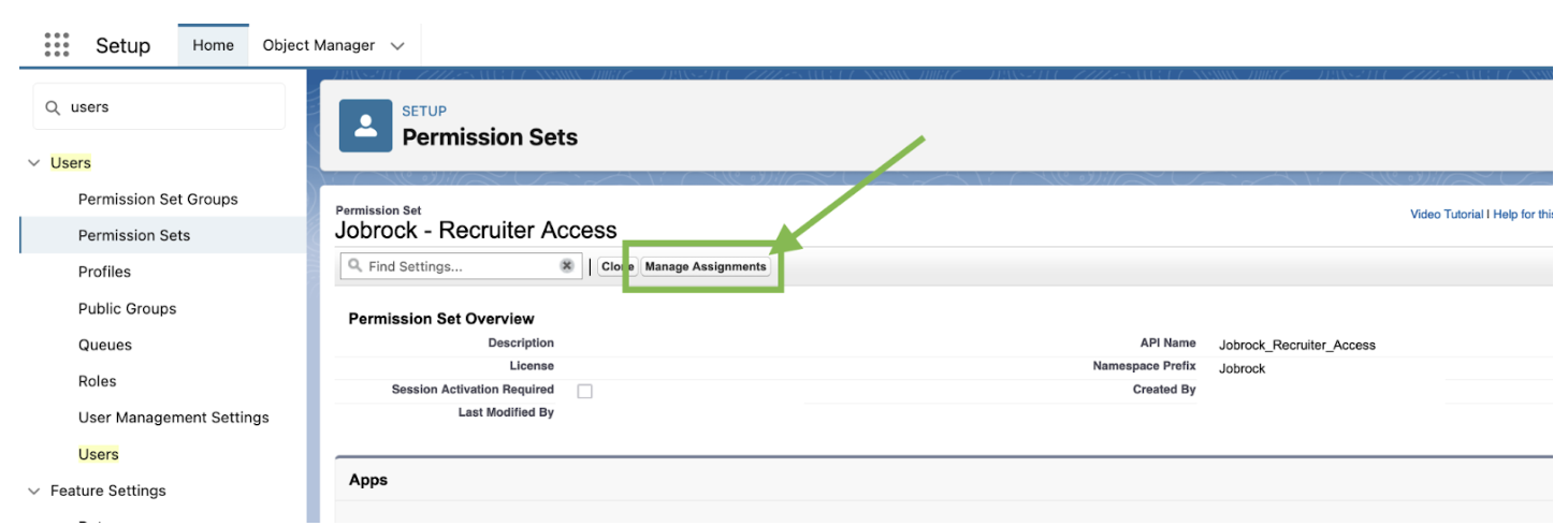 Click on "Permission Sets" in the dropdown menu and locate the permission set label you wish to modify, which can be either "Jobrock Admin Access" or "Jobrock Recruiter Access."