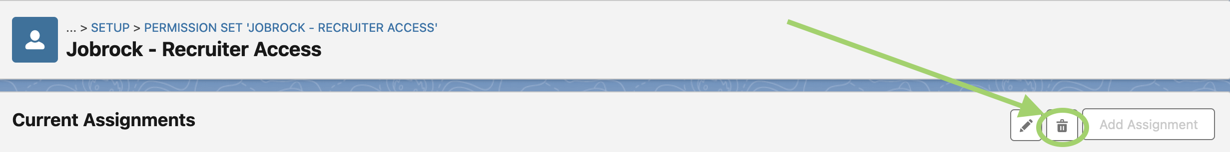 Click the trash bin icon to activate the "Remove Assignment" option, allowing you to remove the Jobrock permission access from the user profile.
