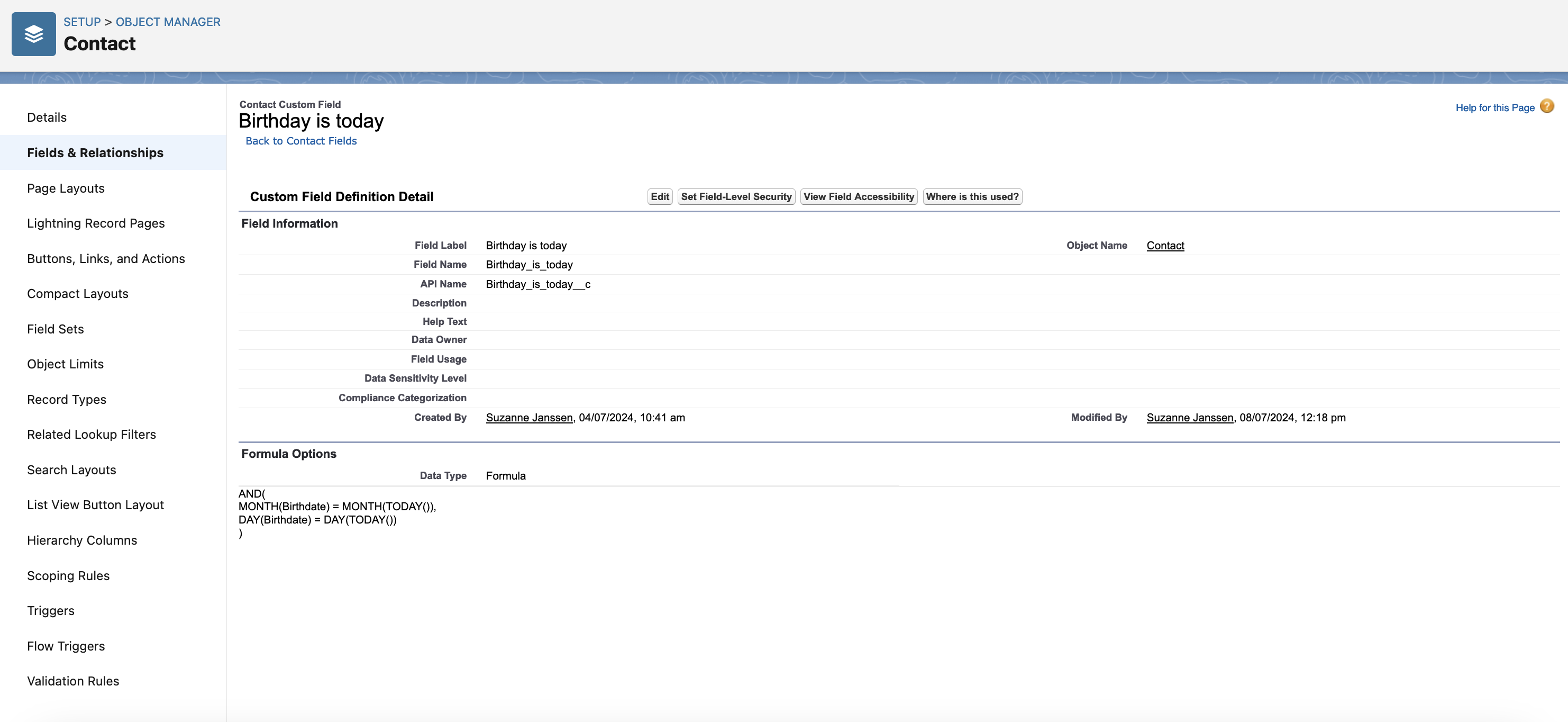 - Field: Select Birthday_is_today__c. (This is the formula which you have created before)