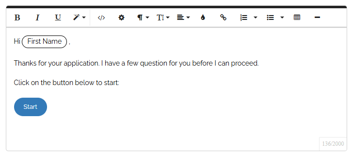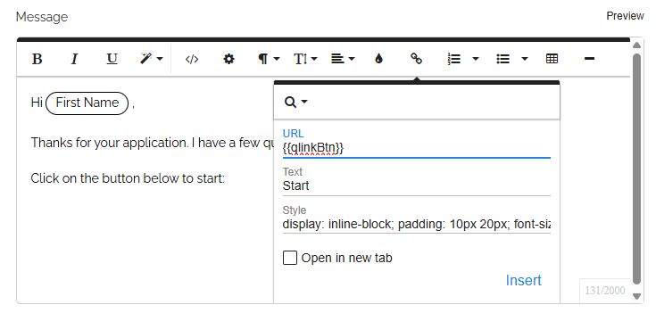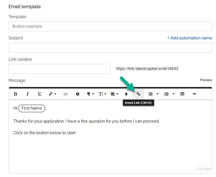Navigate to the automation invite template you want to add the button to and click the "Insert Link" icon.