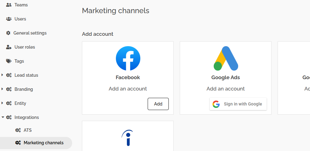 - Go to Admin > Integrations > Marketing channels. Click the "Add" button in the Facebook section.
