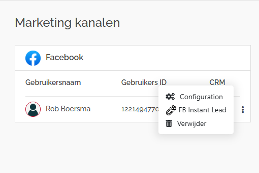- Once the Facebook user has been added, click on the three dots and select the "FB Instant Lead" option in the drop down menu.
