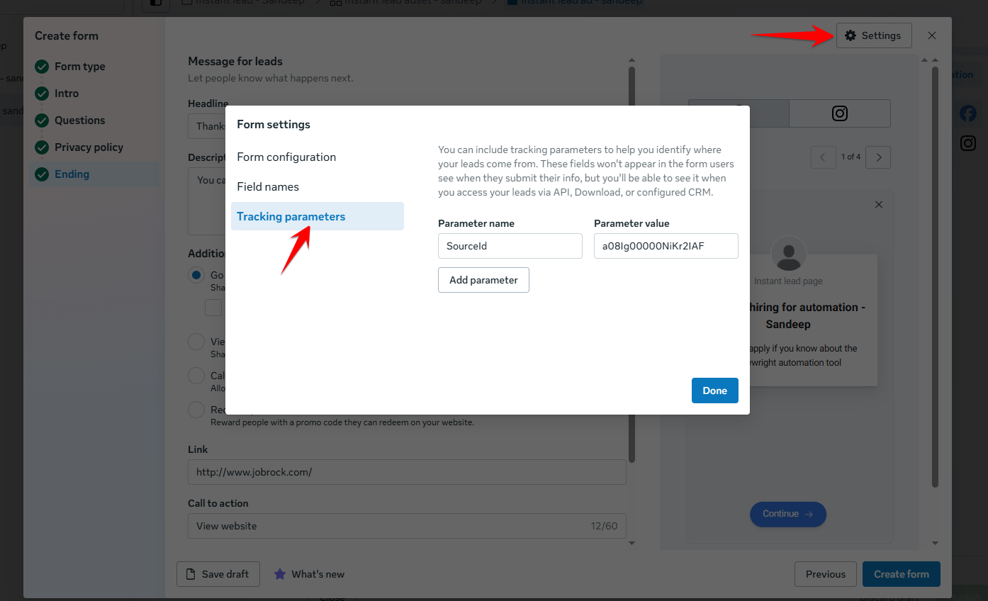 - Now you need to create an instant lead form in your Facebook ads. During the Instant Lead Form creation, navigate to "Form Settings" and choose "Tracking Parameters".