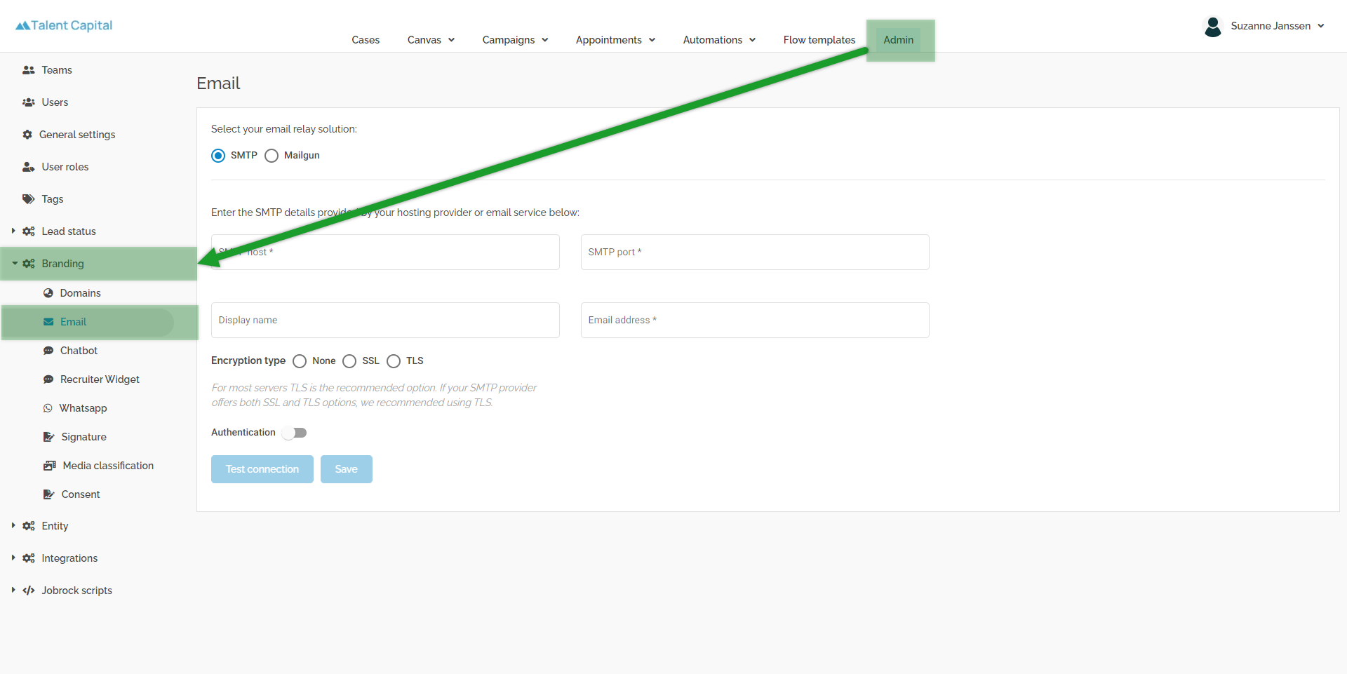 Go to the Email configuration screen in the Jobrock admin module via Admin > Branding > Email.