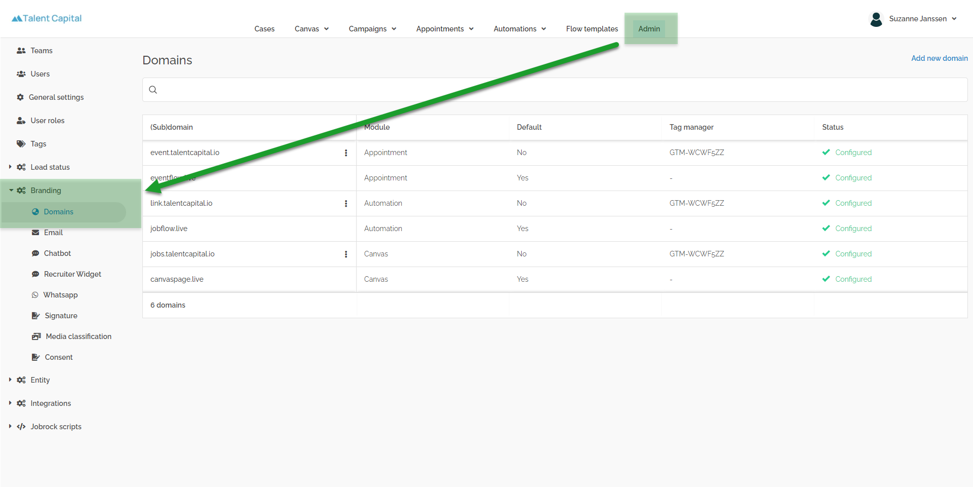 Go to the Domains configuration screen in the Jobrock admin module via Admin > Branding > Domains.