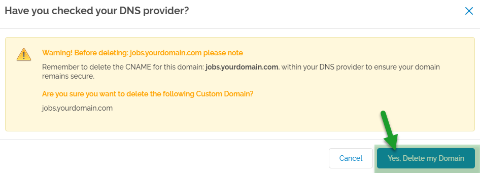 A pop-up appears which will ask you whether you are sure to remove the custom domain from Jobrock. Also this pop-up will tell you to check your DNS settings for this domain
