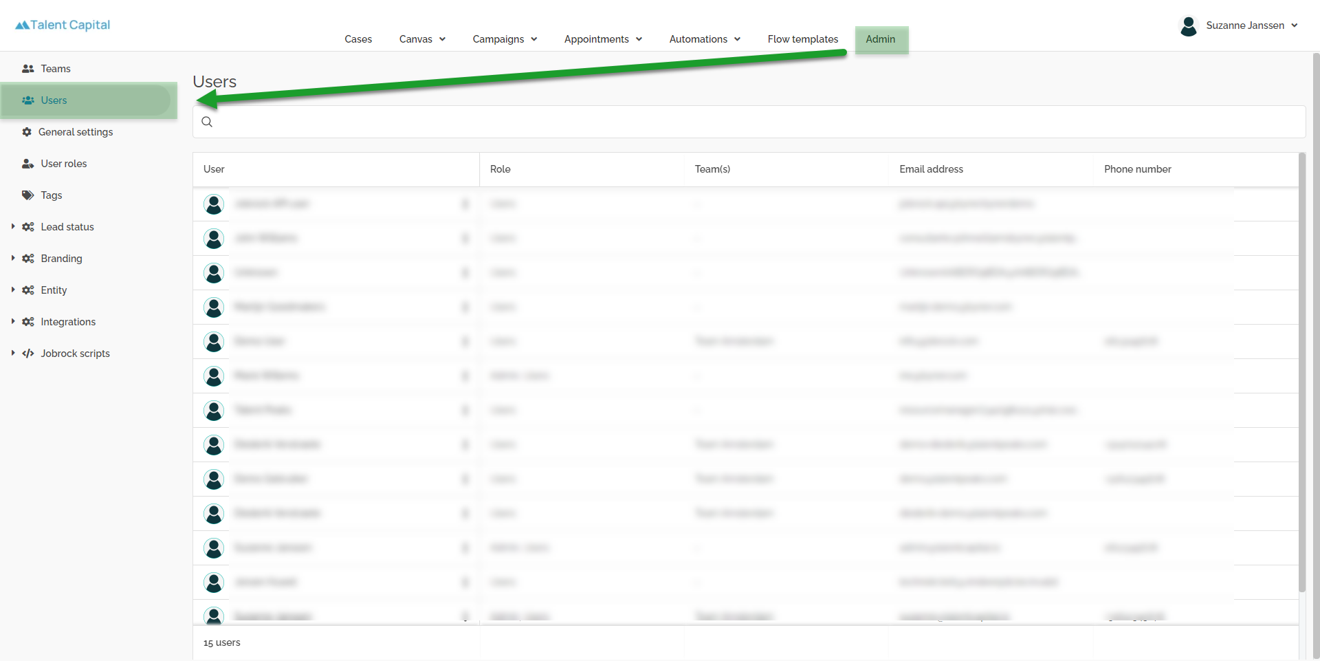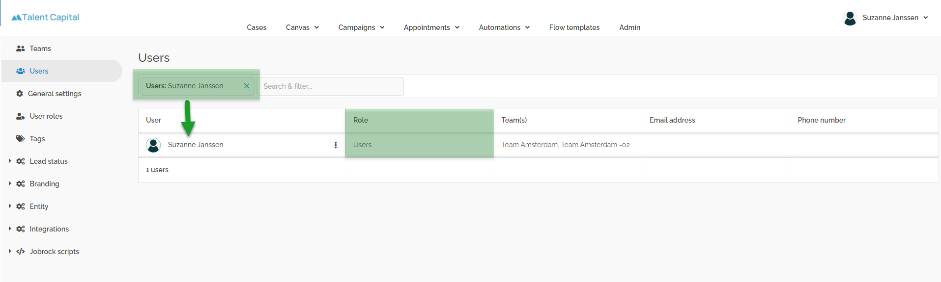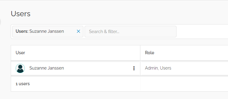 Select or search for the user (in our example Suzanne Janssen) who should receive admin rights.