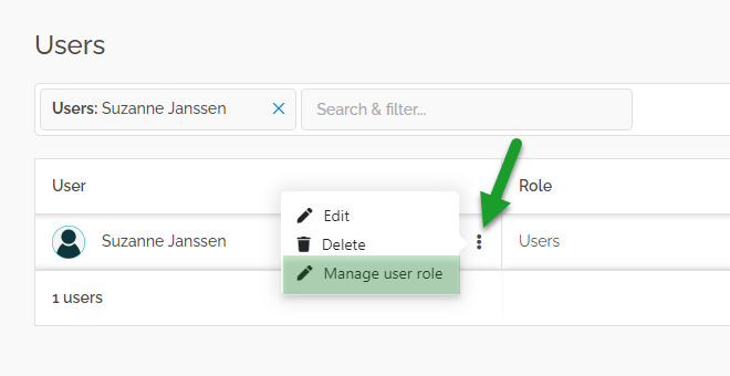 Search for the user who should receive admin rights. Click on the 3 dots behind the user and select Manage user role in the drop down menu.
