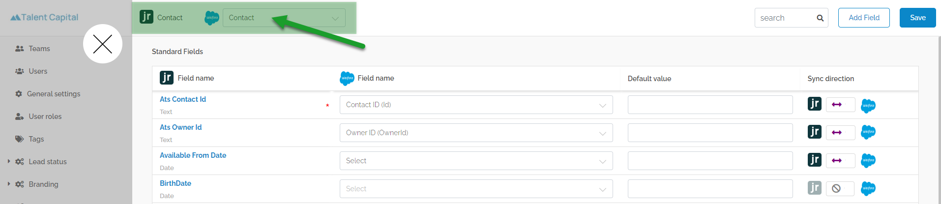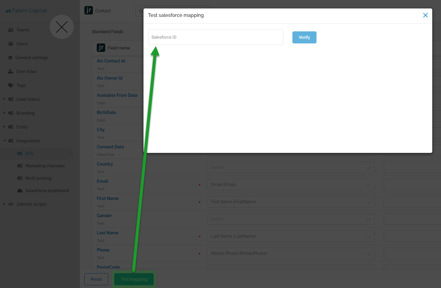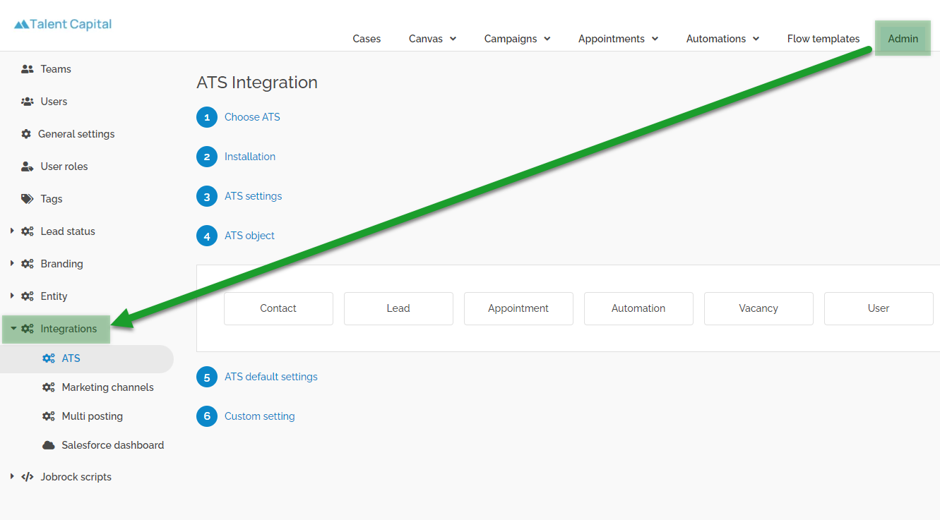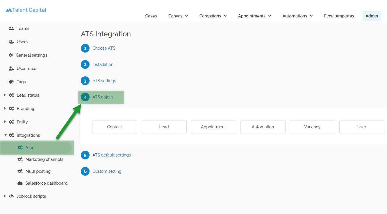Navigate to Admin -> Integrations -> ATS -> ATS object (step 4) -> Contact