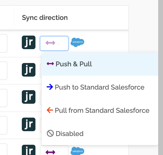 If the "Disabled" sync direction is selected, there won't be any synchronization of data between Jobrock and Salesforce possible.