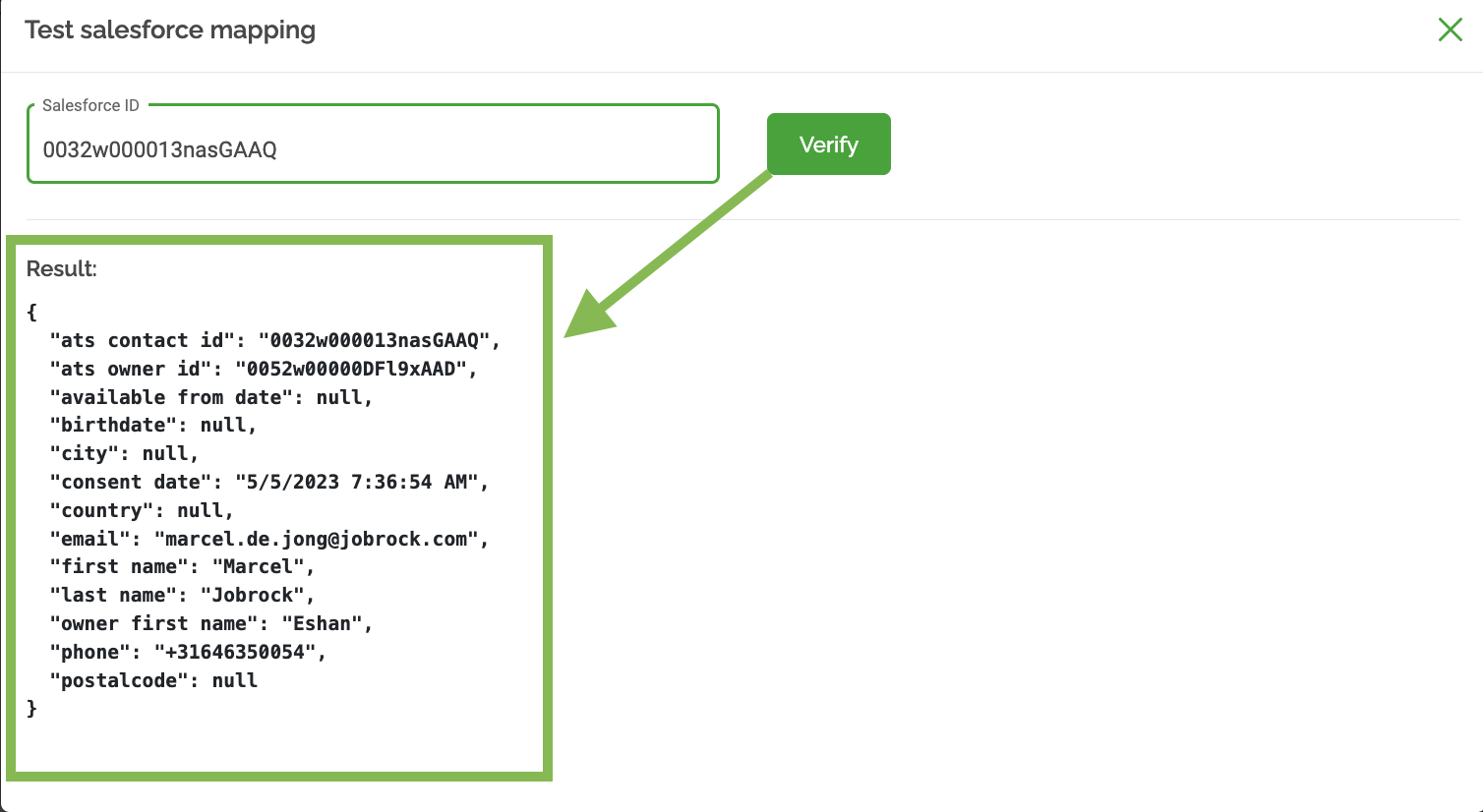 NOTE: To verify that the mapping is correct, make changes to a field in the test contact in Salesforce, and repeat steps 4 and 5. Once the changes are reflected in Jobrock, the mapping is confirmed to be correct.