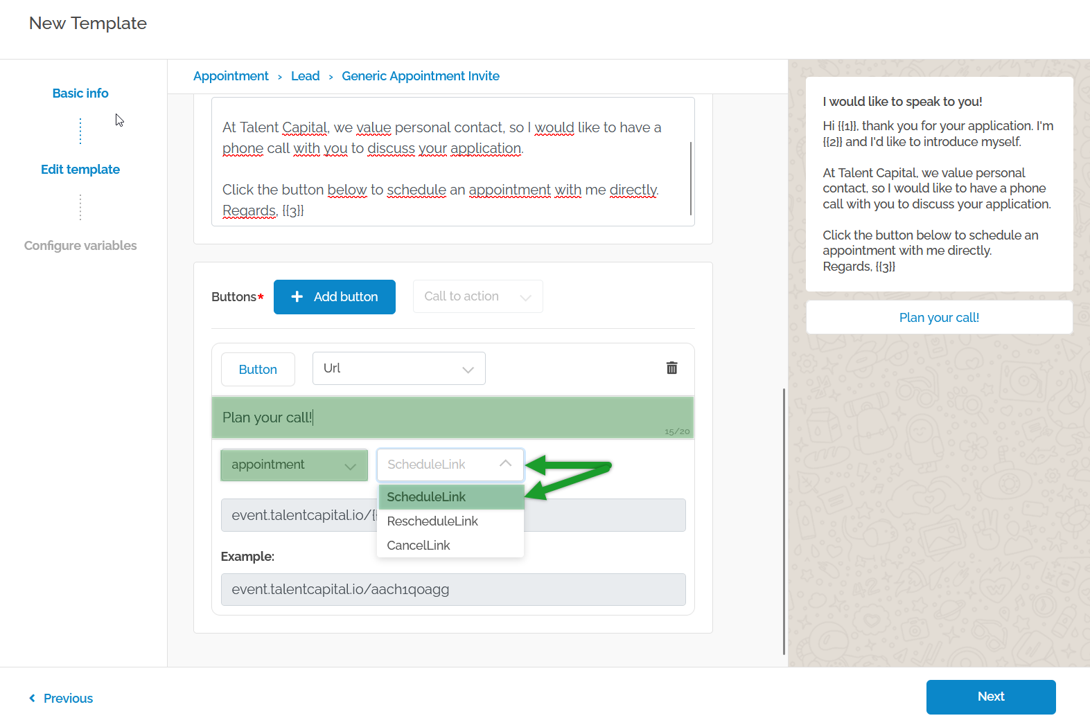 This article explains how to create an appointment invitation WhatsApp template. This invitation message will request the candidate to schedule a meeting with one of the team members, such as a recruiter.