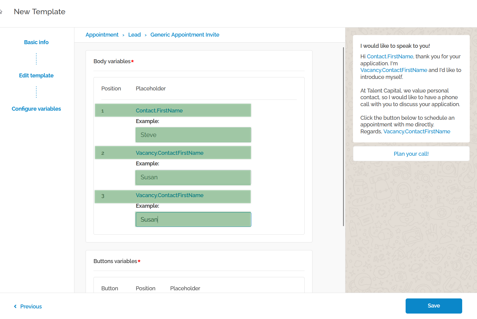RELATED ARTICLE: Use variables such as {{1}}, {{2}}, etc. to personalize templates with names, recruiter names, vacancy or appointment details, etc. Read more about variables here.